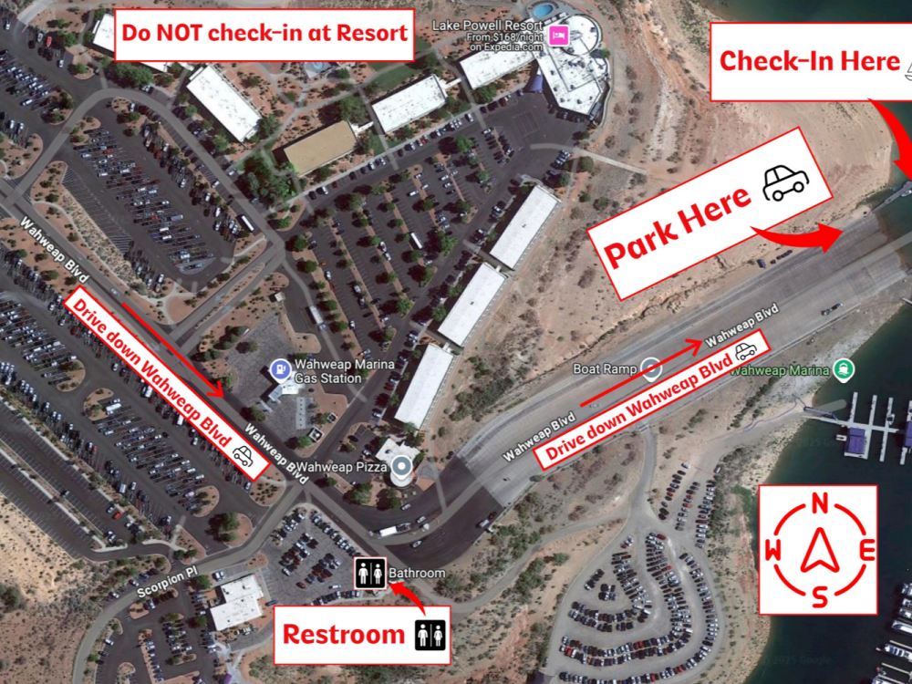 | Wahweap Main Launch Ramp Please be sure to arrive at the floating dock on the left 30 minutes early.Wahweap Main Launch Ramp Below Wahweap Blvd. We will depart from dock at the Wahweap Main Launch Ramp below Wahweap Blvd 15 minutes beforestart time. It takes approximately 20-30min to drive to the check-in location from Page, so be sure to plan accordingly. Due to the low water level, there are orange traffic barricades marking the end of the ramp. Guests can park on the left side of the ramp near the bottom where there is striped parking. THIS IS DAYTIME PARKING so you can ignore the signage reading "30 minute parking". From here, guests will walk below the large, orange traffic barricades and continue down the ramp. Directly below the launch ramp, you will see 2 floating docks on the water. Your captain will meet you on the LEFT dock. (If you are walking toward the large houseboats to the right, you are walking in the wrong direction.) | Please note the time slot when placing an order | Wahweap Boulevard, Page, AZ 86040. |
